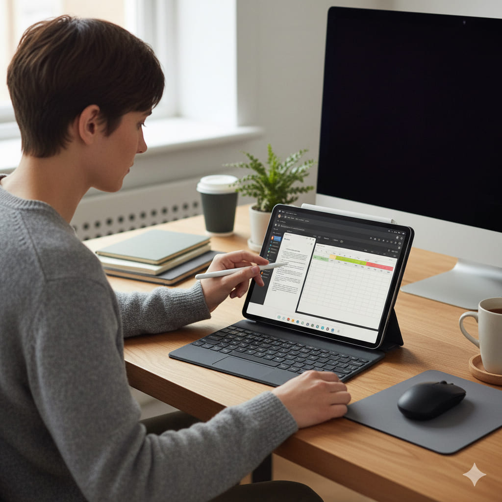 - 本格的なマルチタスクの難しさ:前述の通り、複数のアプリやウィンドウを頻繁に切り替えながら行う複雑な作業は、パソコンに比べて効率が落ちる可能性があります。「資料Aを見ながら、資料Bを参考にしつつ、Excelでデータ入力し、同時にWebで情報を調べる」といった作業は、画面の大きいパソコンの方が快適です。